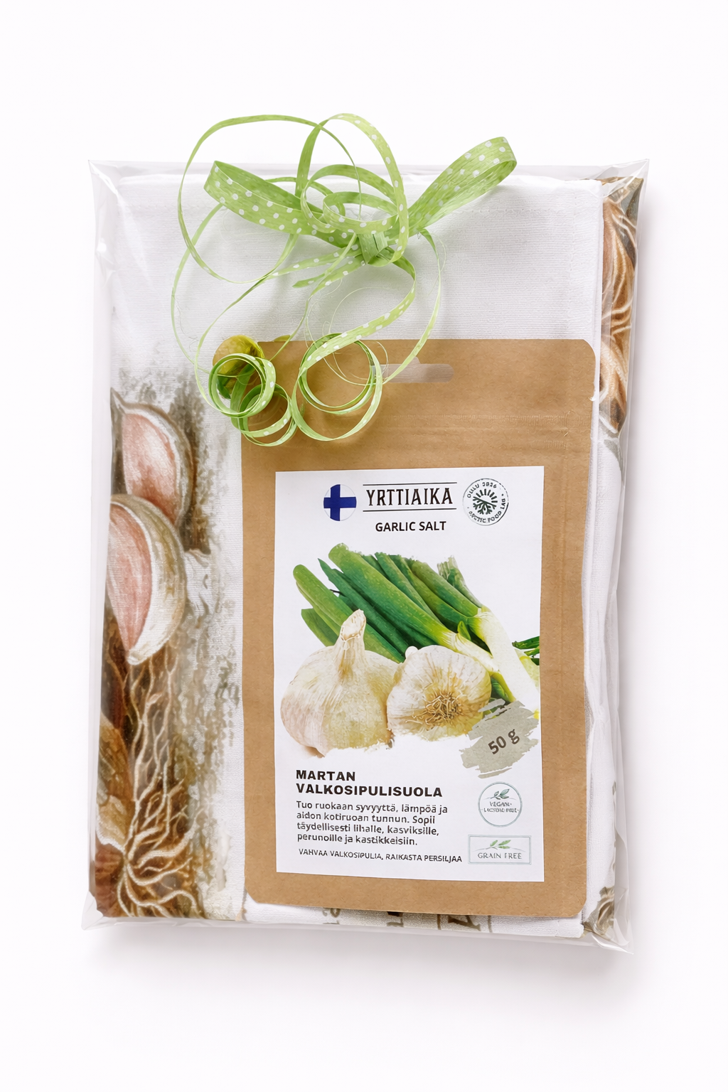 Settiin voit valita kauniin valkosipuliaiheisen keittiöpyyhkeen lisäksi sekä laadukkaan Martan valkosipulisuolan tai Tzatzikimausteen, tai vaikka molemmat. Sinä päätät.