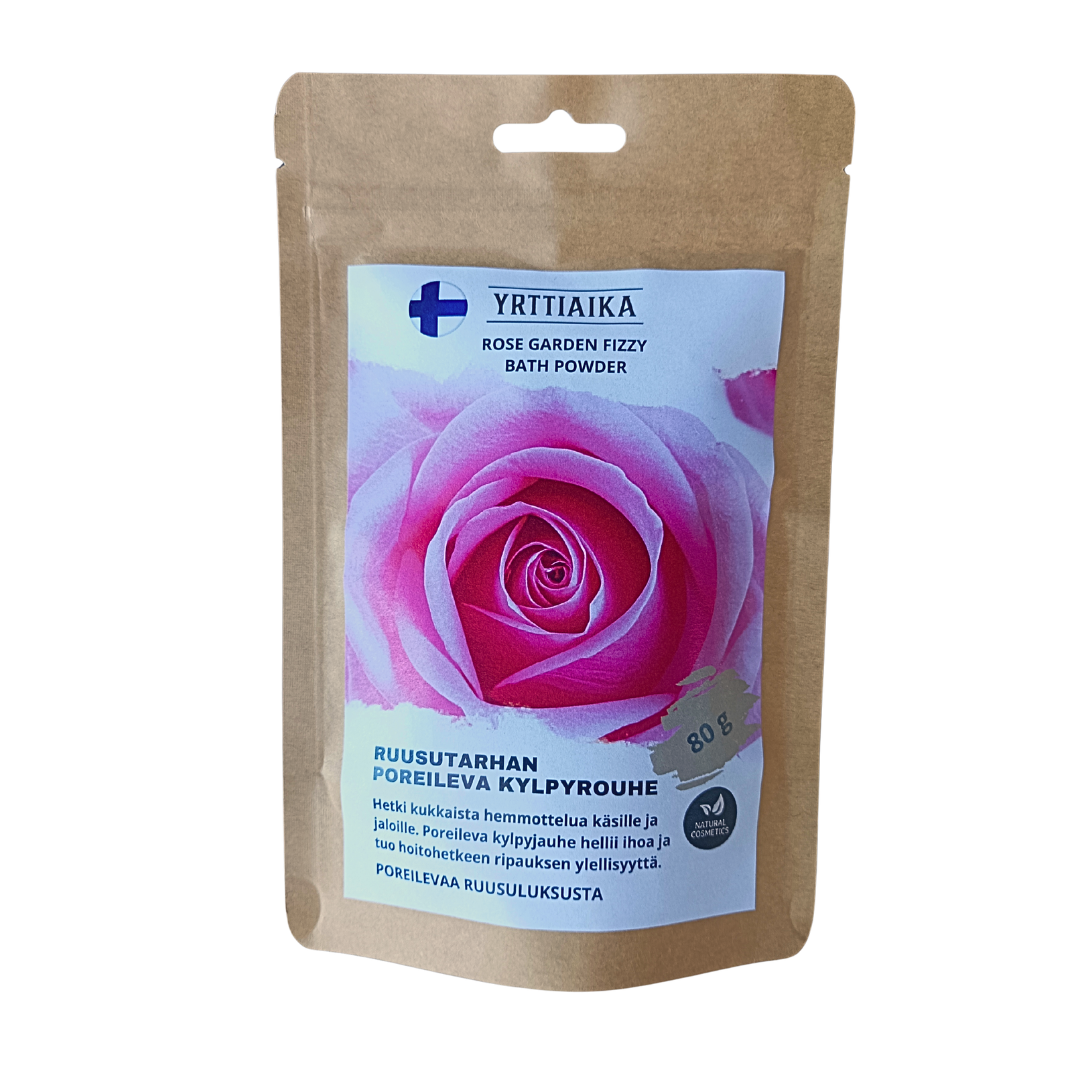 Hemmottele käsiäsi ja jalkojasi kotimaista ruusua ja mesiangervoa sisältävällä poreilevalla kylpyjauheella. Lisää 1 rkl jauhetta lämpimään veteen ja kylvetä käsiä tai jalkoja 10-15 minuuttia. Kylpy pehmentää kovettumia, joita voi hoidon jälkeen hangata varovasti esimerkiksi hohkakivellä.